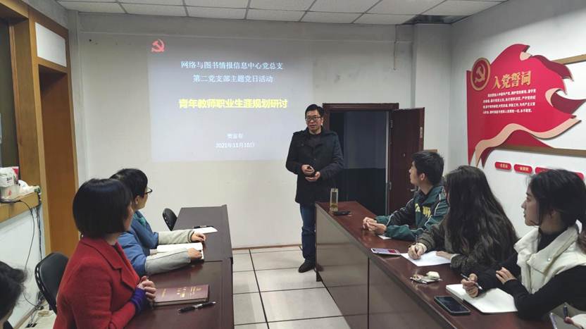 为帮助支部青年教师在干好本职工作的同时,做好个人职业发展规划,助力学校“申硕升大”目标,2021年11月10日晚上7:30,网络与图书情报信息中心党总支第二党支部在办公楼2楼210会议室开展主题党日活动。党支部书记樊富有为支部全体党员做了题为《青年教师职业生涯规划研讨》专题宣讲,第二党支部全体党员同志参加党课学习,同时邀请了部分非党员同志参加。
